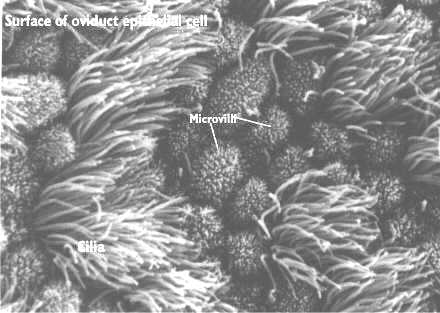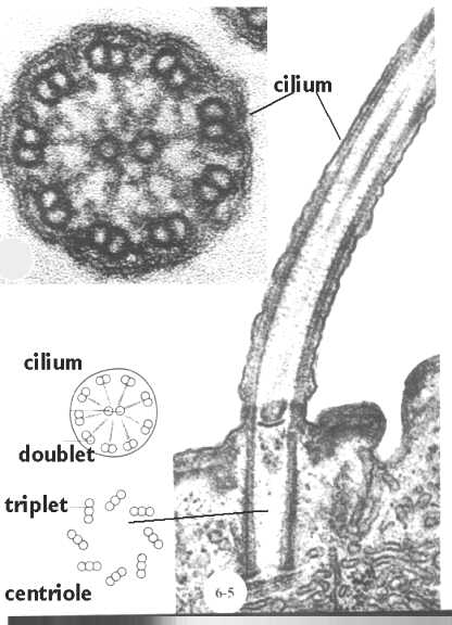 Looking at the cross section, what structures make up the 9 sets of doublets and the two singlets? What is the basal body (which gives rise to cilia?). How do cilia move? What proteins are used to make the cilia bend? The following photograph shows the difference between cilia and microvilli at the EM level. Epithelial cells with microvilli show a dense brush-like array. The cilia are long and move in a wave-like motion. In the oviduct, the cilia are important to help move the egg down the tube on its way to the uterus.