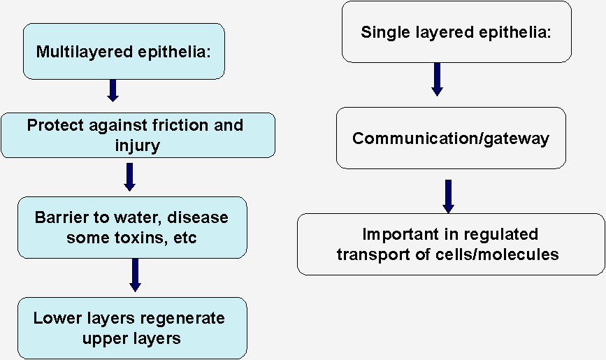 Define the Functional significance of layering. A stratified epithelium may provide more protection to the organ against friction, etc. Also, the outer layers of the cells could be sloughed off as the epithelium encounters friction. However, it would be more difficult to design a transport system in a stratified epithelium because of the numerous cell layers. This is why the simple epithelia have become important as "regulatory barriers". A simple epithelium may regulate transport through the epithelial cells by membrane transport proteins, endocytosis and special barrier junctions.