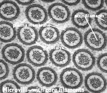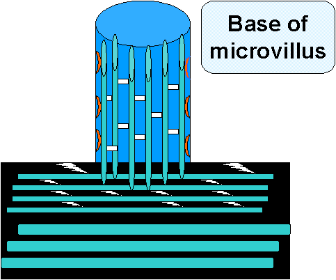 Microvilli are filled with actin filaments that bind to a web of thin filaments below the microvilli. This web is called the "terminal web". The microvilli can contract, like fingers flexing. From your understanding of thin filaments, speculate how this contraction can occur. The micrograph below shows the actin filaments in the core of the microvilli. The cartoon shows actin (green rods) held together by actin binding proteins (finbrin, villin, or fascin) shown as white rods running horizontally between the actin filaments. Along the periphery are the myosin molecules (red). Amorphous capping proteins (blue cap) are at the tip of the microvillus to prevent depolymerization.