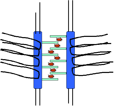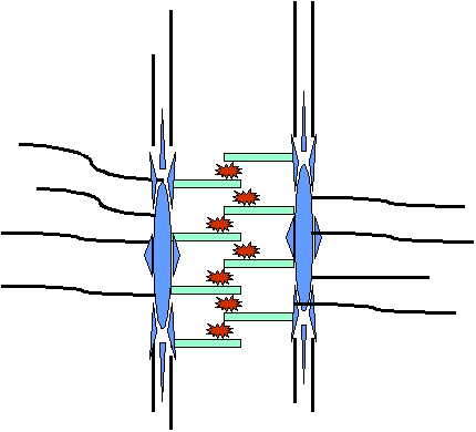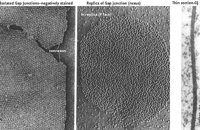 The following photograph shows the gap junctions prepared three different ways. Recall that negative staining is the deposition of heavy metal around a structure that is floated on a water surface. The photo on the left shows the donut shape of the connexon molecules. The middle photograph is a freeze-fracture/freeze etch view and the right hand photo shows an ultrathin section through the junction.