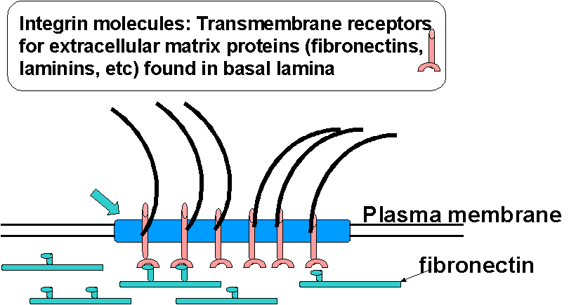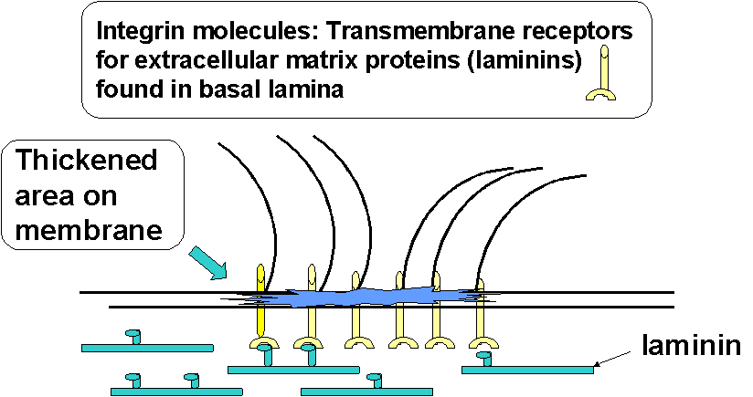 Dense plaque on plasma membrane contains desmoplakins (blue region in above cartoon). These are sites for insertion and attachment of intermediate filaments. Integrins are receptor proteins that are also concentrated at the site probably in a membrane phospholipid "raft". They are integral membrane proteins (passing through the plasma membrane). The cytoplasmic side interacts with filaments and the exoplasmic site (extracellular domain) binds a specific ligand. In this case the ligand is an extracellular membrane protein called "fibronectin".