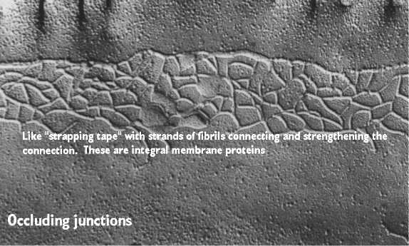 Adherent junctions (figure to the right) are similar to desmosomes in that they have cadherin binding in the center along with calcium. However, the plaques on the plasma membranes contain alpha actinin. Review lectures on muscle and thin filaments to aid your understanding of actin and alpha actinin. Tight Junctions. The most apical is the tight junction. It involves a fusion of the two adjacent membranes with fibrous connections, something like "strapping tape". The following photograph shows a freeze-fracture/freeze etch view of a tight junction (zonula occludens). Review the membrane web page for more information about freeze-fracture/freeze etch.