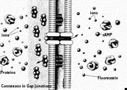 Gap Junctions The next junction in the series is the Gap junction. Recall from the first Cell Biology course that the Gap junction allow cells to communicate with one another. Small molecules can pass through pore-like transmembrane proteins called connexons. Connexons are made of subunits called connexins. The following photograph shows this diagrammatically. Note that ions, molecules like fluorescein, and second messengers can pass from cell to cell. How might this be used to spread a signal?