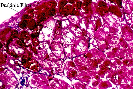 14) List the features that distinguish cardiac muscle from smooth muscle ________________________________________________________________________ 15) Identify the small dark lines running orthogonal to the direction of the fibers. What is the significance of these lines___________________________________________________________________? The following photograph shows longitudinally cut cardiac muscle fibers. 16) Slide 16 shows cardiac muscle that also contains Purkinje cells. Identify them and look at an electron micrograph of a Purkinje cell. Why do the Purkinje cells look so empty?________________________________________ What is their function?________________________________________________________ Return to top of page | Course Design | Learning Aids | Learning modalities | |