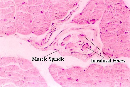 Cross section through skeletal muscle showing a muscle spindle. Inside there are muscle fibers that help this sensory apparatus. (Intrafusal fibers)