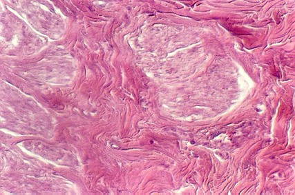 This section is through the dermis of the skin over the nipple of the breast. There are bundles of smooth muscle (lighter staining) running in the dense pink stained connective tissue. Large lactiferous sinuses can be found in the slide with the section of the nipple. These are lined with stratified cuboidal epithelium and are the culmination of lactiferous ducts that originate from mammary gland ducts.