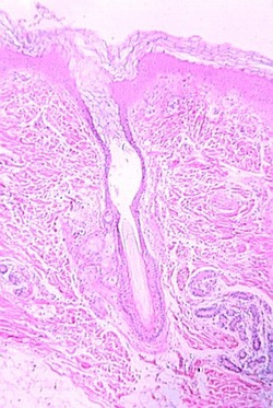 Look at hair follicles in your slide of thin skin (Slide 24). Hairs are also found in the hypodermis growing up into the dermis. Each hair arises from an epidermal invagination, the hair follicle, that teminates in a dilation called the hair bulb. Find these structures in the following photographs.