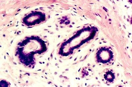 Non-lactating mammary glands. Note the extensive connective tissue inside the lobules. Identify gland cells and myoepithelial cells.