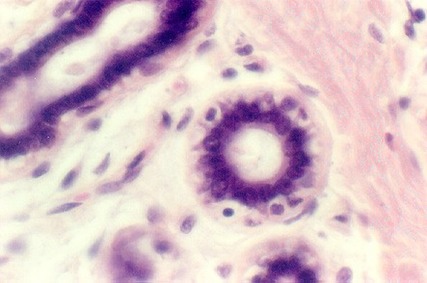 In your slide of thick skin (slide 25) identify secretory and duct portions of eccrine sweat glands. The following photographs show both portions. You should find a myoepithelial cell and classify the type of epithelium in the duct.