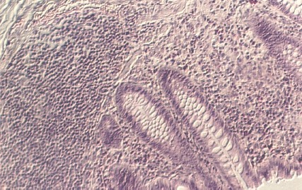 The following photo shows a better view of the lamina propria which is the core of the villi. Strands of smooth muscle, vessels, and numerous cells typical of connective tissue are found in this region.