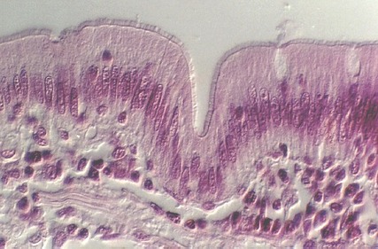 The above photograph shows a higher magnification of the colon epithelium with its numerous Goblet cells. Compare this view with that showing the SURFACE MUCOUS CELLS of the stomach.
