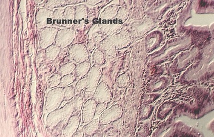 The base of the villus is called the CRYPT of LIEBERKUHN or INTESTINAL CRYPT. Under the crypts, you can find more lamina propria, strands of MUSCULARIS MUCOSA, and glands that distinguish the esophagus called BRUNNER'S GLANDS. These glands produce mucus and most of the glandular portion is located in the submucosa. Can you find a bundle of MUSCULARIS MUCOSA in the following photograph? The submucosa is the red connective tissue, seen best in the left of this photo.