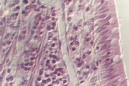 glands, the Crypts. You can see clearly the granulated PANETH CELLS distinguished by
