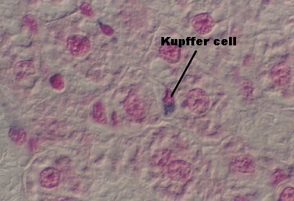 Stretching across the SINUSOIDS are phagocytic cells called KUPFFER CELLS which are distinguished by their processes. The following photographs show Kupffer cells.