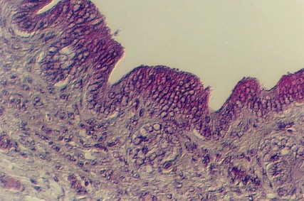 The following slide shows an empty gall bladder. Note that the MUCOSA is stretched out in the distended gall bladder and thrown into many folds in the empty organ. The epithelium is simple columnar with a small brush border. There is no muscularis mucosa. Underneath the epithelium is the submucosa. The muscularis externa consists of irregularly interwoven strands of smooth muscle, collagenous and elastic fibers. The following figure shows the distended gall bladder.