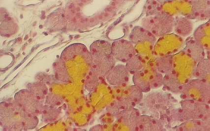 This shows a section of the submandibular gland stained with Masson's trichrome and Alcian yellow. The yellow stain detects the mucous cells. They are easy to distinguish.