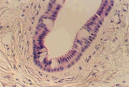 Below is another view of a large (excretory) duct of a salivary gland showing the mucin in Goblet cells after a special stain. What might be the advantages of an epithelium that has a basal cuboidal cell layer and an apical columnar cell layer?
