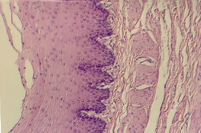 layers of cells are stained dense purple. The apical layers face the esophagus lumen and