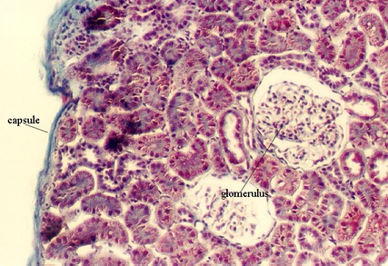 If you hold the section of the kidney up to the light, you can distinguish the CORTEX from the MEDULLA. In the Masson stained section, note the blue-stained CAPSULE covering the surface. View the same regions with the low magnification of the microscope.