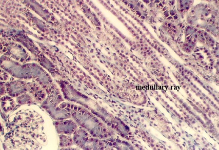 Find a medullary ray in your slides. In the rays, you can identify the LOOP OF HENLE by its squamous epithelium. Also, you can see COLLECTING TUBULES by their cuboidal epithelium. The vessels in the medullary ray are the VASA RECTA.