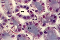 In contrast, Distal tubules have no brush border (DT). They have lateral interdigitations, however. They are distinguished from proximal tubules by the fact that they have a smoother apical surface. Also, the cells are smaller. Therefore, it is likely that one will see a nucleus in every profile. In contrast, proximal tubule cell profiles may not show as many nuclei. Find a peritubular capillary in the above photograph by the presence of stacked red blood cells.
