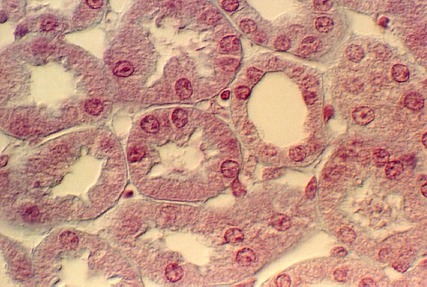 Move into the medulla and find the tubules there. You should be able to distinguish the VASA RECTA by their content of blood cells. Also, the thin limbs and the thicker limbs of the LOOP of HENLE can be seen. Finally, the COLLECTING TUBULES are cuboidal and columnar. They grow taller as they descend in the medulla. Identify the three types of tubules in the above photograph by the size and shape of their epithelium and the presence or absence of blood cells. What is the function of the thin limb of the Loop of Henle? What is the function of the Vasa recta? What is the function of the Collecting ducts?
