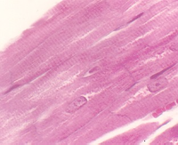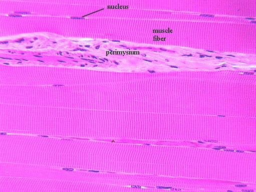 Above is a photograph of skeletal muscle cut in longitudinal section. The thin blue nuclei are found at the periphery of each cell or fiber (which is multinucleated). You can also see the striations. In the middle of the section is a connective tissue division, called "perimysium”.