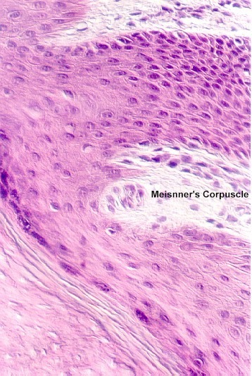 Skin also includes important pain, touch and pressure receptors. A Meissner's Corpuscle, which is a touch receptor, is shown in the following figure.