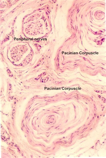 Another very large receptor looks like a sliced onion. It is called a Pacinian corpuscle. The following photo shows two Pacinian Corpuscles .