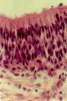 The nuclei nearest the lumen belong to the Sustentacular cells. They are elongated. The middle layer of nuclei are rounder and somewhat paler. These belong to the Olfactory cells. The nuclei of the Basal cells are the third layer, nearest the connective tissue. They may be difficult to identify. Study an electron micrograph of Olfactory cells and learn how they are specialized for olfactory sensation. Also, learn the function of each of these three cell types.