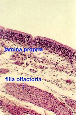 Underneath the epithelium is connective tissue called the Lamina Propria, which is loose connective tissue. You can identify glands which produce the fluid that dissolves substances to be smelled. These are called Bowman's glands. You can also see large nerve fiber bundles of Cranial Nerve I.called the Filia Olfactoria. These will synapse in the olfactory bulb.