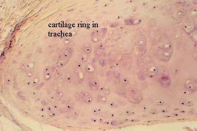Note the C-shaped tracheal ring. If you have studied bone and cartilage, you may have already identified perichondrium and the chondrocytes in this hyaline cartilage. The cartilage is replaced by smooth muscle and elastic fibers in the posterior wall of the trachea in your slide.
