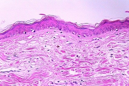 This is a slide of thick skin in which you have already identified the tissues in the epidermis, dermis, and hypodermis. Just for review, what tissue type is in each layer: The following photo shows a slide of thick skin. 2) Identify the layers of the epidermis on the photo.