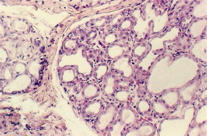 Non-lactating mammary glands. Note the extensive connective tissue inside the lobules. Identify gland cells and myoepithelial cells.
